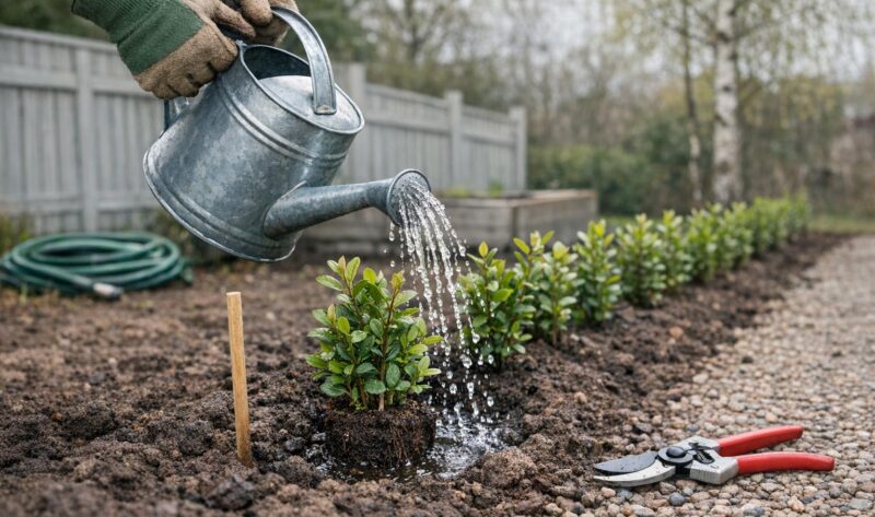 Säsongsanpassad checklista för ligusterhäckens första år — plantering, vattning, beskärning, gödsling och vinterskydd för en tät och etablerad häck.