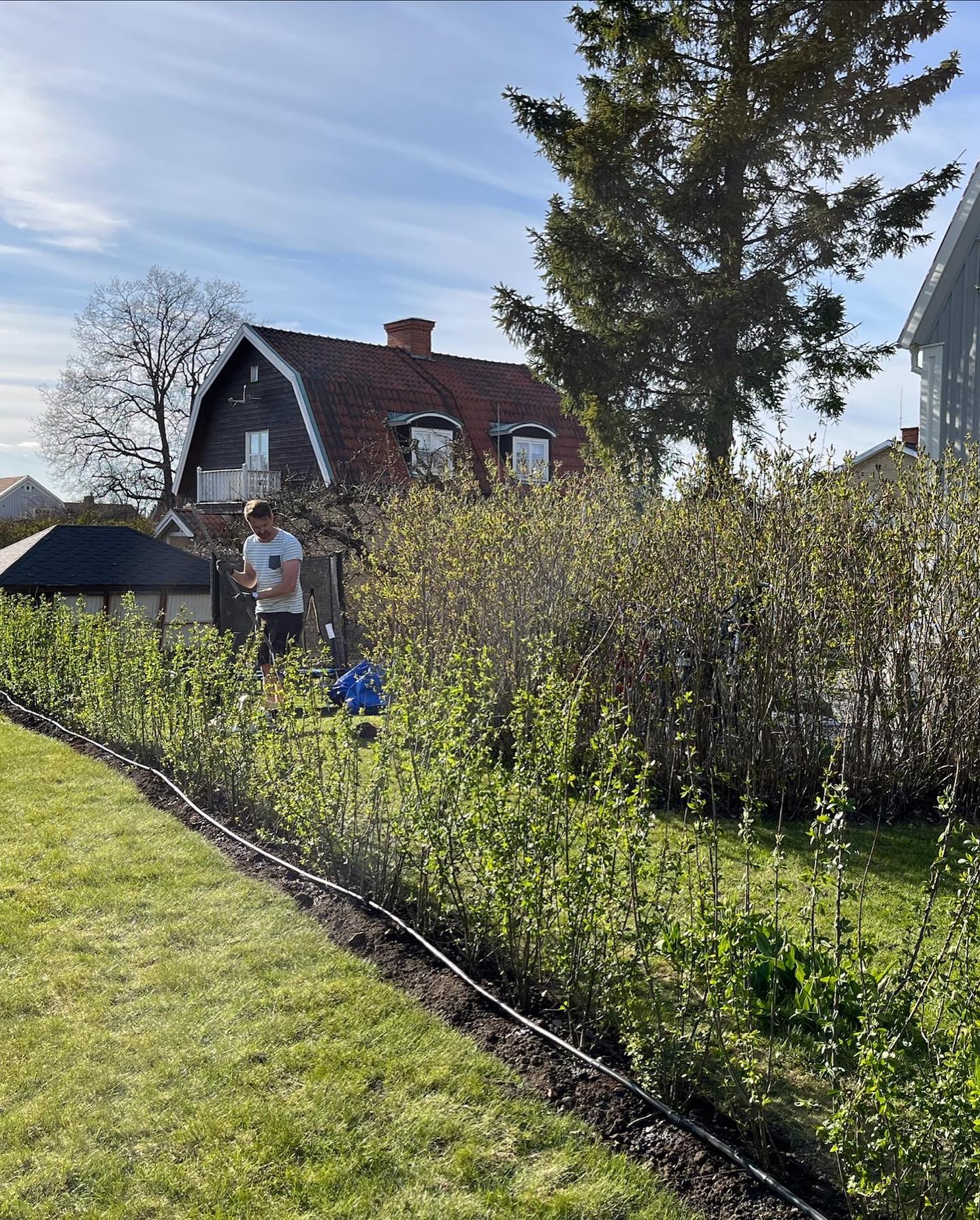 Vita blommor i juni. Svarta bär genom hösten. Tät tillväxt som ber om ett till två klipp per år — inget mer.